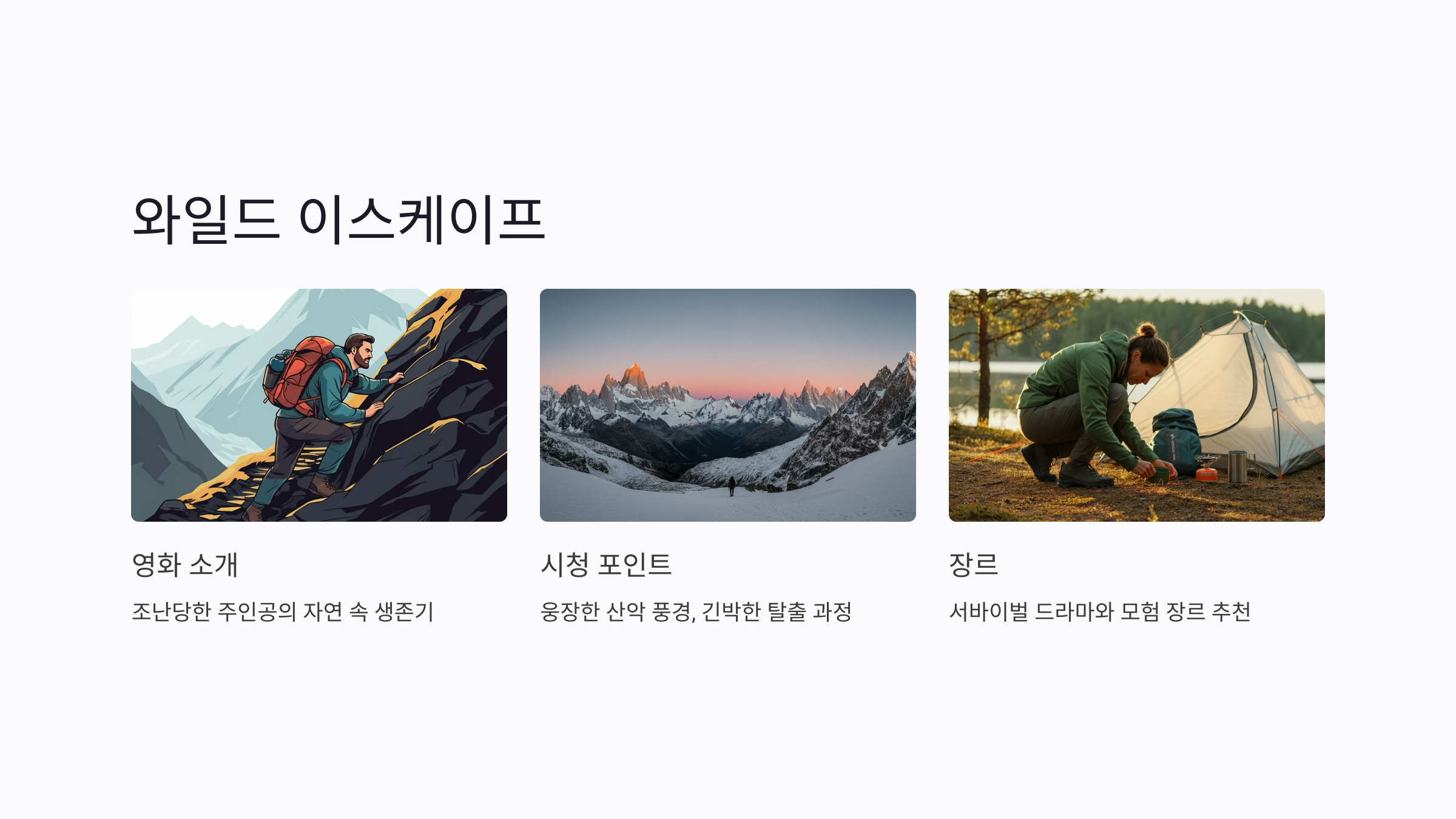 ‘와일드 이스케이프’는 산악 마을에서 조난당한 주인공이 자연 속에서 생존을 위해 고군분투하는 이야기를 담은 탈출 드라마입니다. 웅장한 자연의 아름다움과 위협을 동시에 담아내어 시청자들에게 강렬한 인상을 남기는 작품입니다.