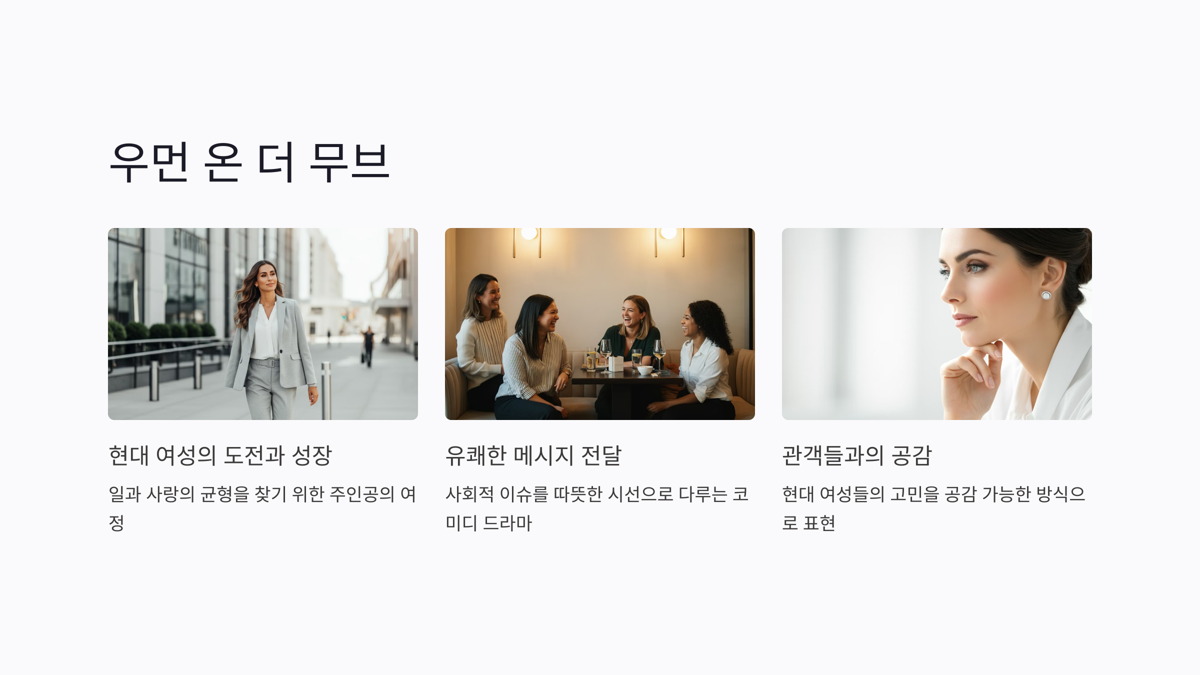 진지한 메시지를 담아내면서도 유머와 따뜻함이 느껴지는 영화로, 현대 여성들이 직면하는 문제를 유쾌하게 풀어냅니다. 유쾌하면서도 진지한 시선으로 삶의 다양한 측면을 조명하여 누구나 공감할 만한 내용을 담고 있습니다.