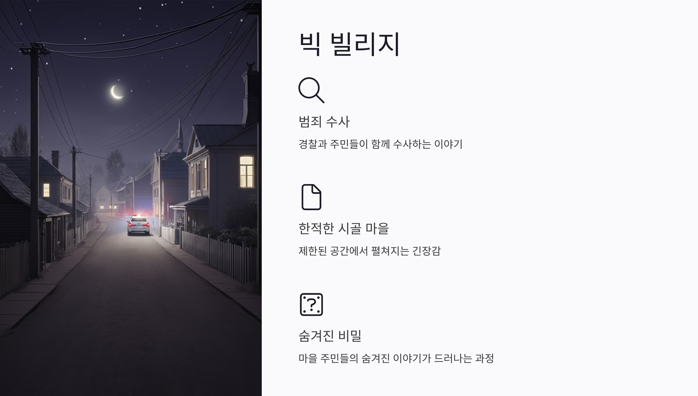 한적한 시골 마을에서 일어난 범죄 사건을 수사하는 경찰과 주민들의 이야기를 그린 ‘빅 빌리지’는 마을 사람들의 숨겨진 비밀이 하나씩 드러나며 긴장감을 더해가는 독특한 작품입니다. 제한된 공간에서 벌어지는 긴장감 넘치는 이야기가 매력적인 영화입니다.