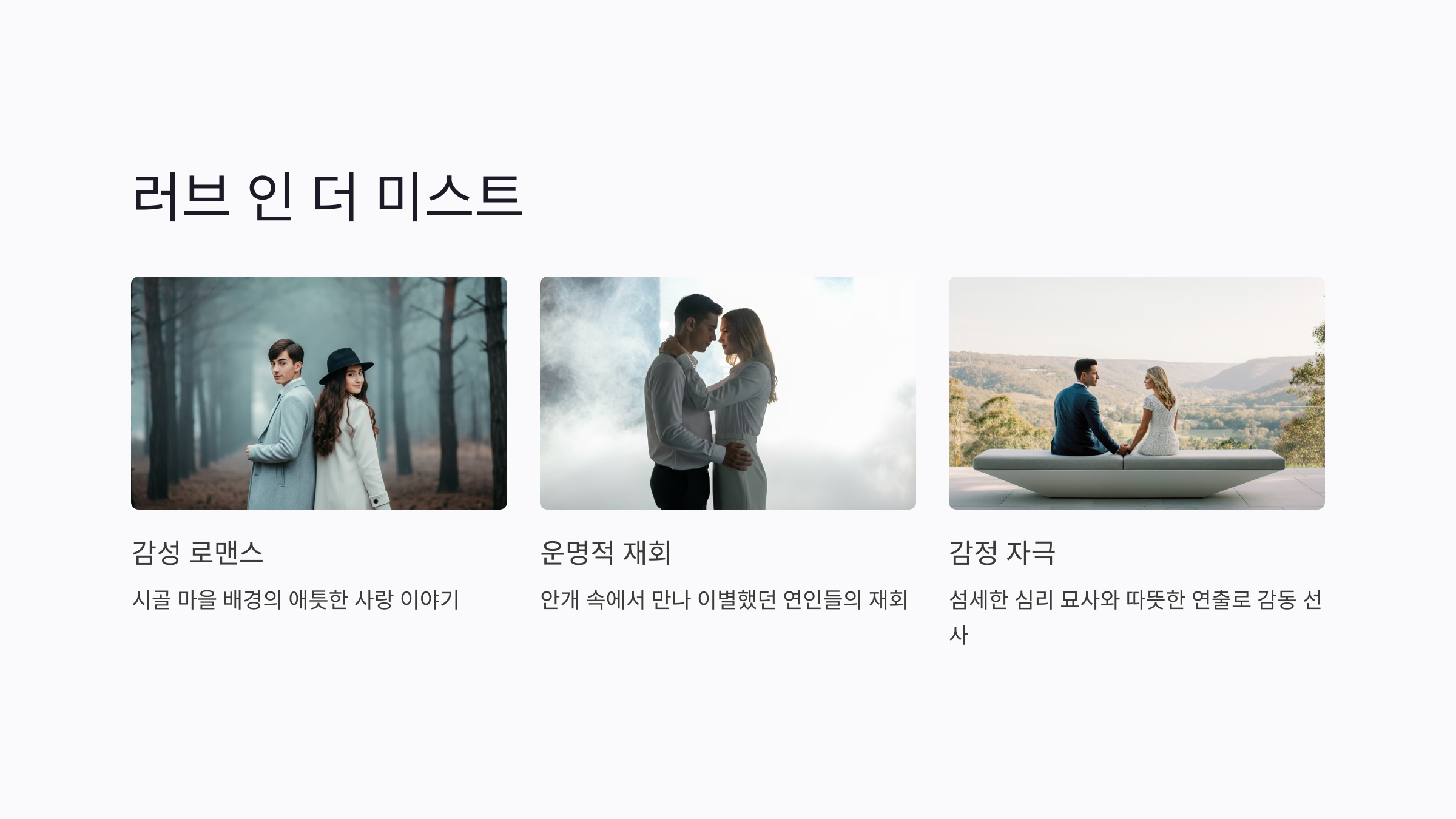안개가 자욱한 마을에서 만나 사랑과 이별을 겪은 주인공들이 다시 운명적으로 재회하게 되는 과정을 담고 있습니다. 고요한 배경 속에서 펼쳐지는 사랑의 이야기가 관객들에게 진한 감동을 선사합니다.