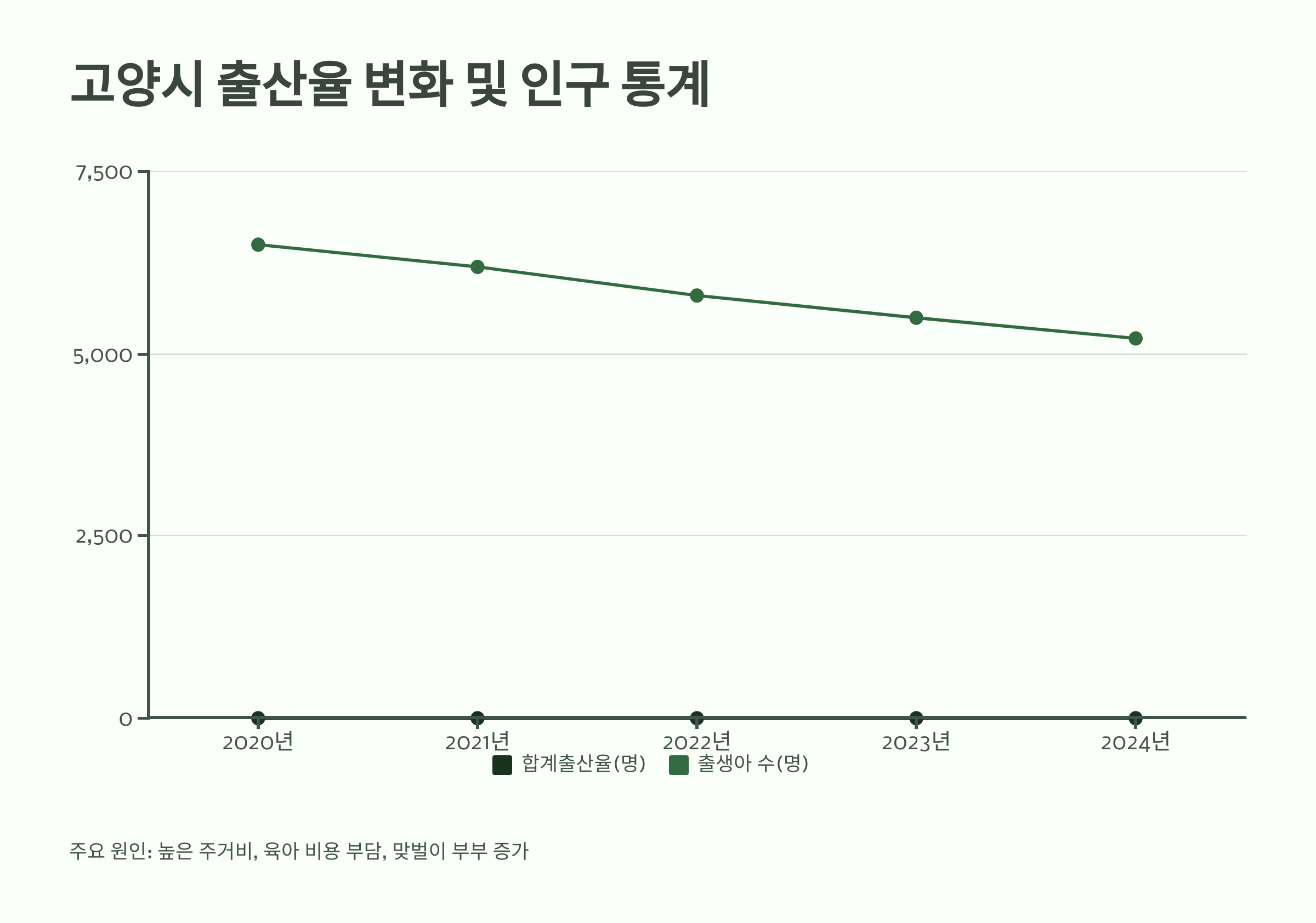 출산율 감소의 주요 원인은 높은 주거비, 육아 비용 부담, 맞벌이 부부 증가 등이 있어요. 이에 따라 고양시는 **출산 및 양육 지원금을 확대**하고, 육아 친화적인 환경을 조성하는 데 집중하고 있어요.