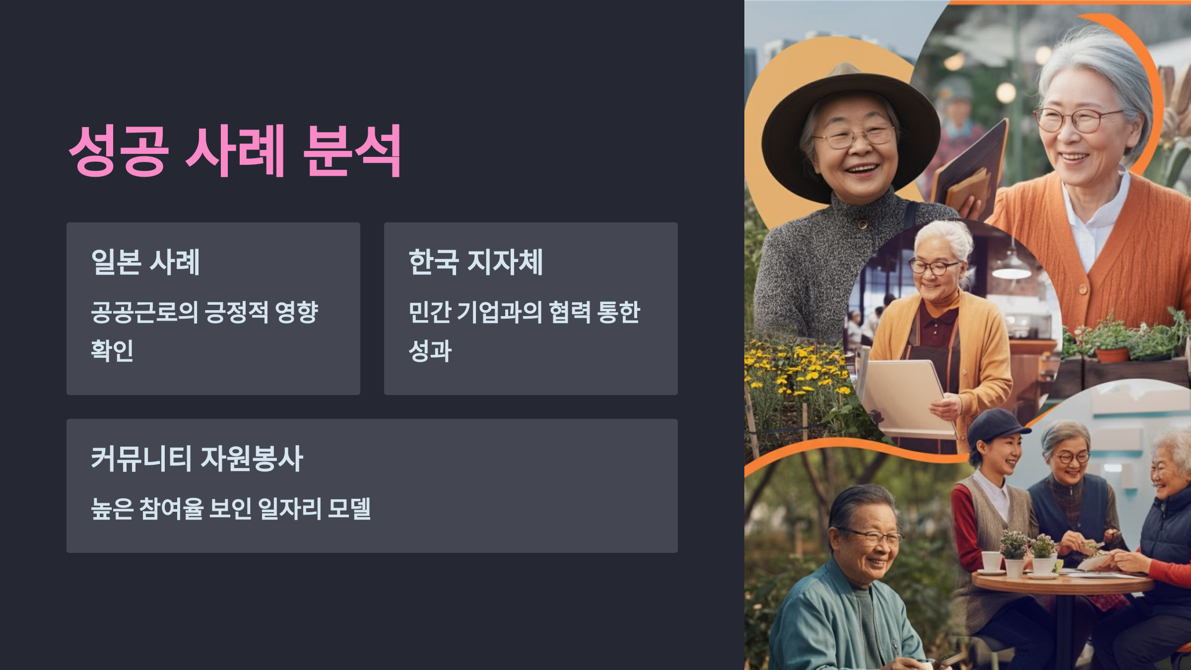 일본의 사례에서 공공근로가 노인의 삶에 미친 긍정적 영향을 확인할 수 있습니다. 공공근로를 통해 노인들은 사회적 고립을 극복하고, 경제적 자립을 이루며, 지역 사회에 기여하는 기회를 얻었습니다.