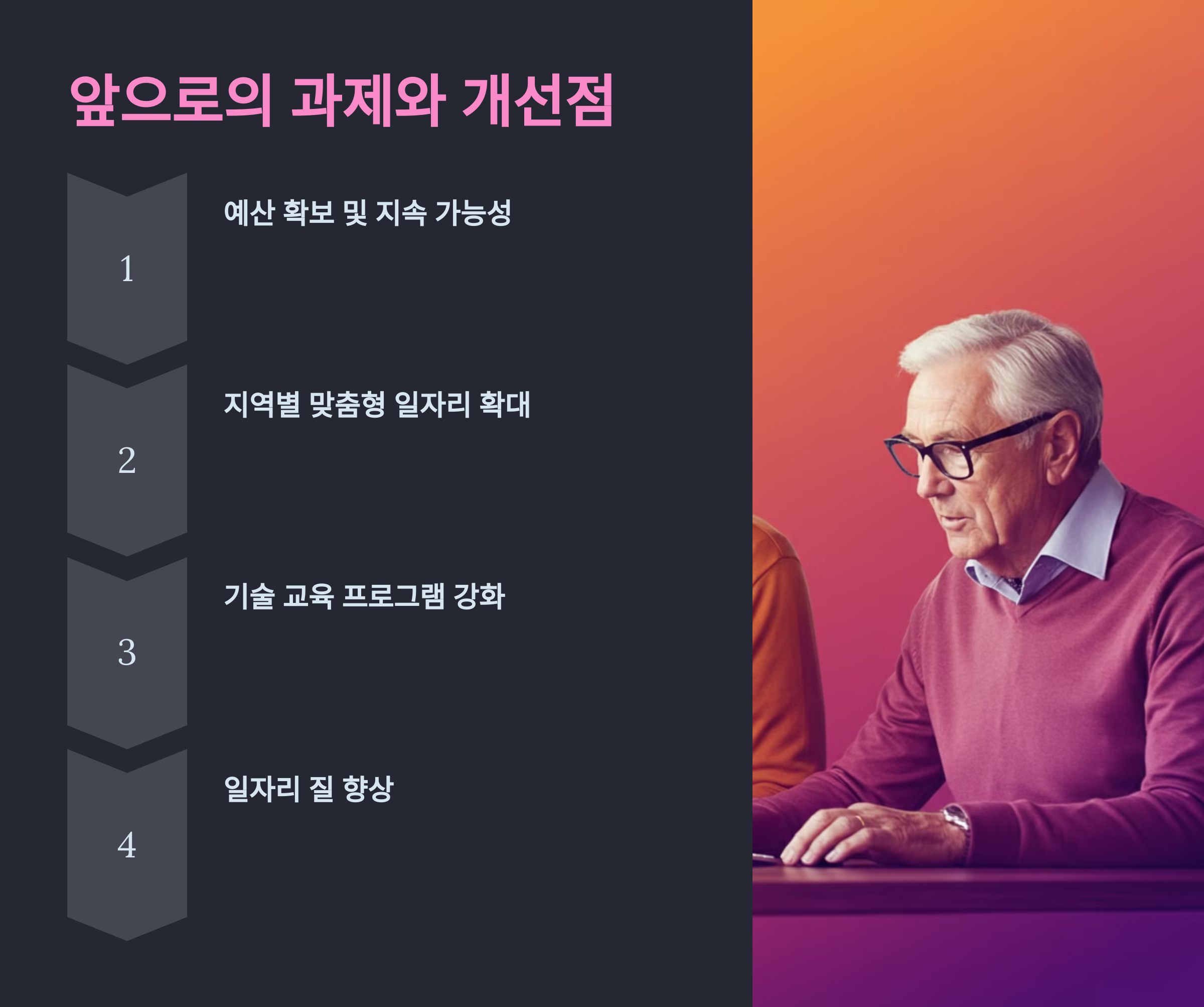 기술 교육과 같은 추가 지원 프로그램이 필요합니다. 노인들이 새로운 기술을 습득하고, 변화하는 노동 시장에 적응할 수 있도록 지원하는 프로그램이 필요합니다.