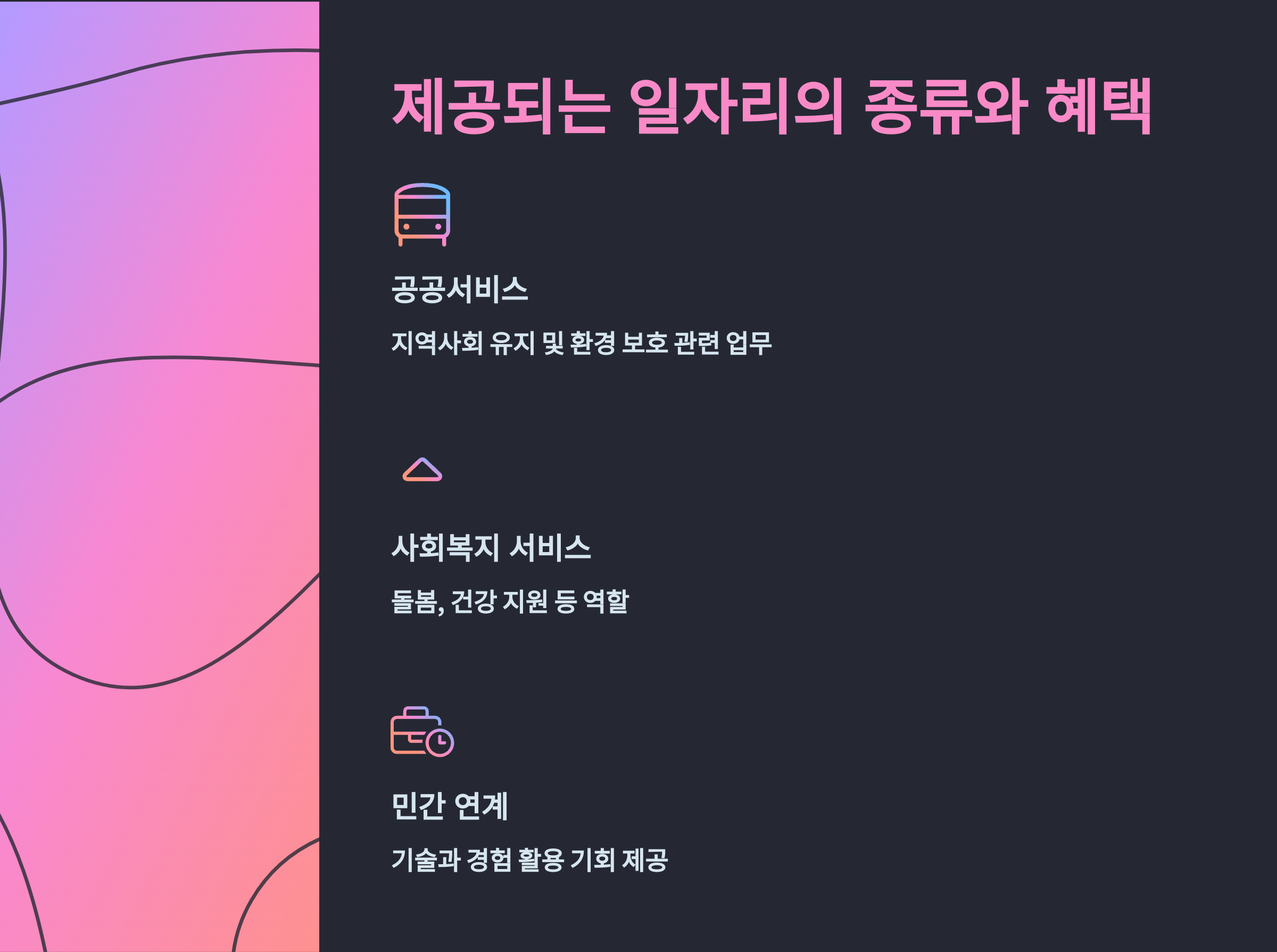 A: 공공근로, 사회복지 서비스, 민간 기업 업무 지원 등이 포함됩니다.