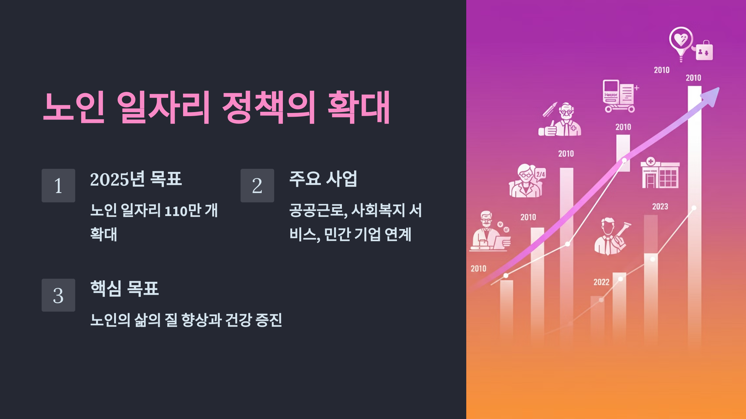 - 일자리 제공 목표: 2025년까지 110만 개의 노인 일자리를 제공하는 것을 목표로 합니다.