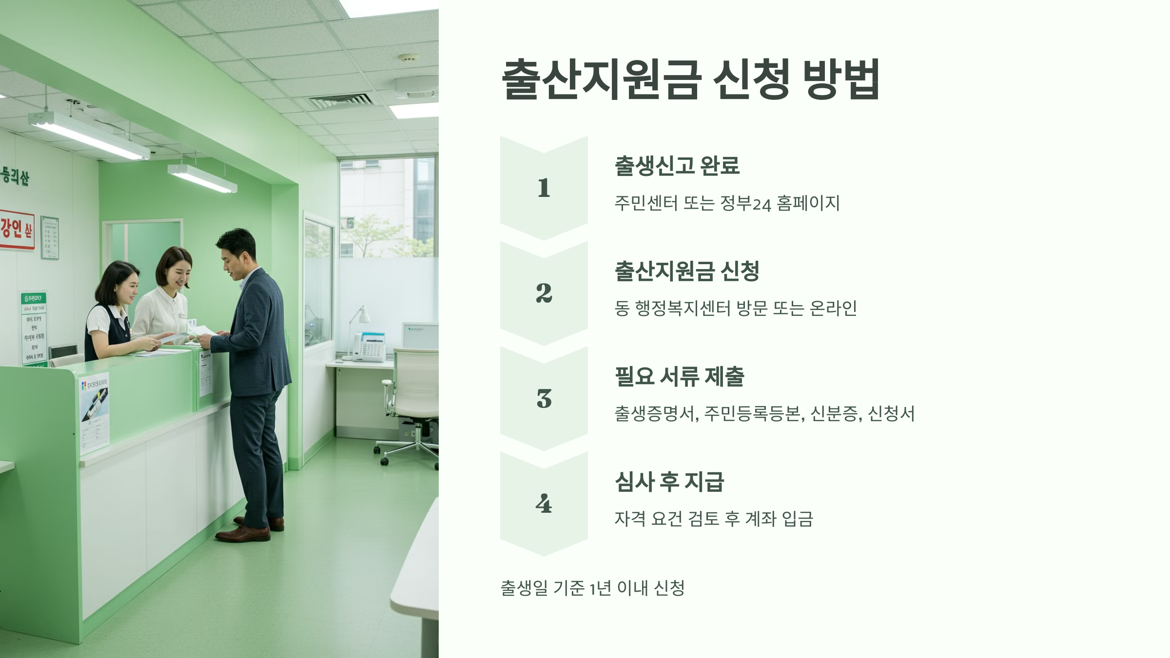 2. 출산지원금 신청: 거주지 동 행정복지센터 방문 또는 온라인 신청 가능.