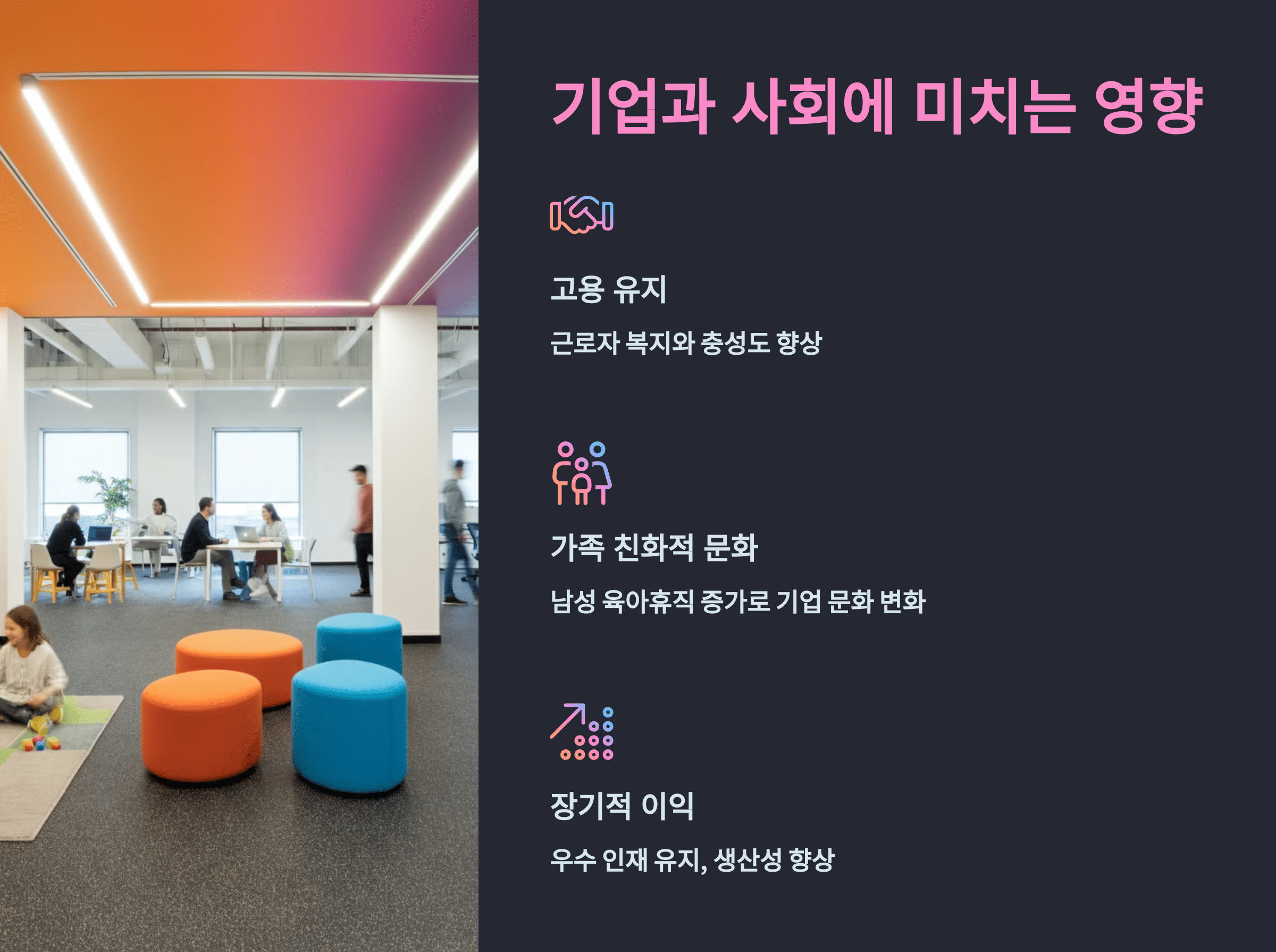 이번 정책은 육아휴직 사용률을 높이며 기업과 사회에 상호 윈윈 효과를 가져올 것입니다. 기업은 근로자의 만족도와 생산성을 높이고, 사회는 양성평등과 가족 중심 문화를 촉진하는 긍정적인 변화를 기대할 수 있습니다.