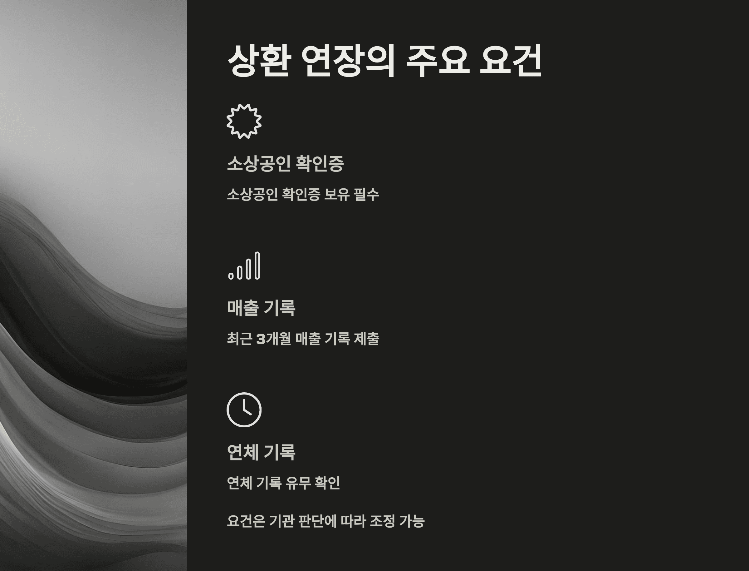 이러한 요건은 주로 소상공인의 재정 상태와 경영 성과를 평가하여 상환 연장의 필요성과 가능성을 판단하는 데 초점을 맞춥니다. 일반적으로 다음과 같은 조건들이 포함됩니다.