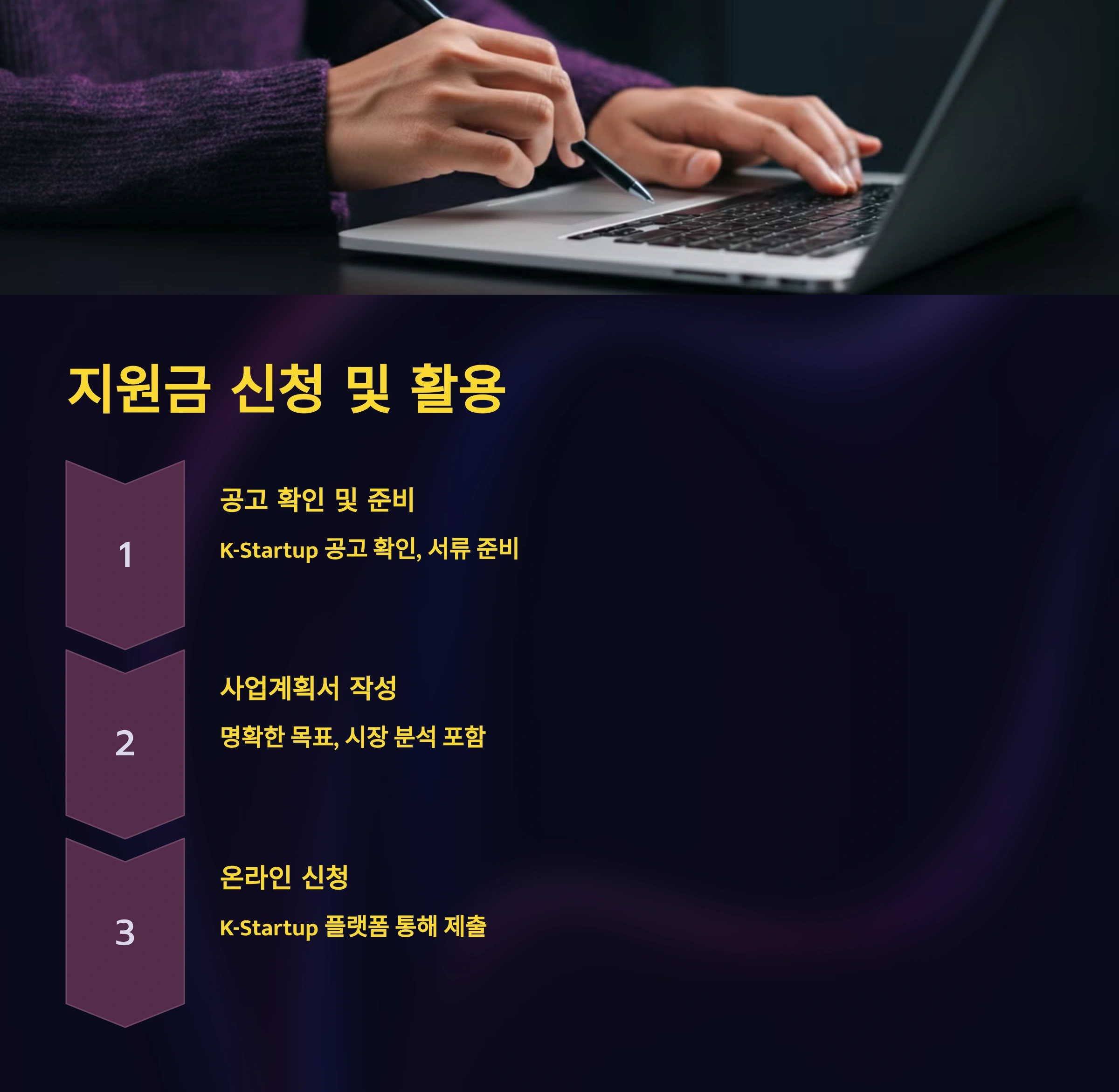 지원금 신청은 주로 K-Startup 플랫폼에서 이루어집니다. 신청서를 제출한 후, 접수 여부를 확인하세요.