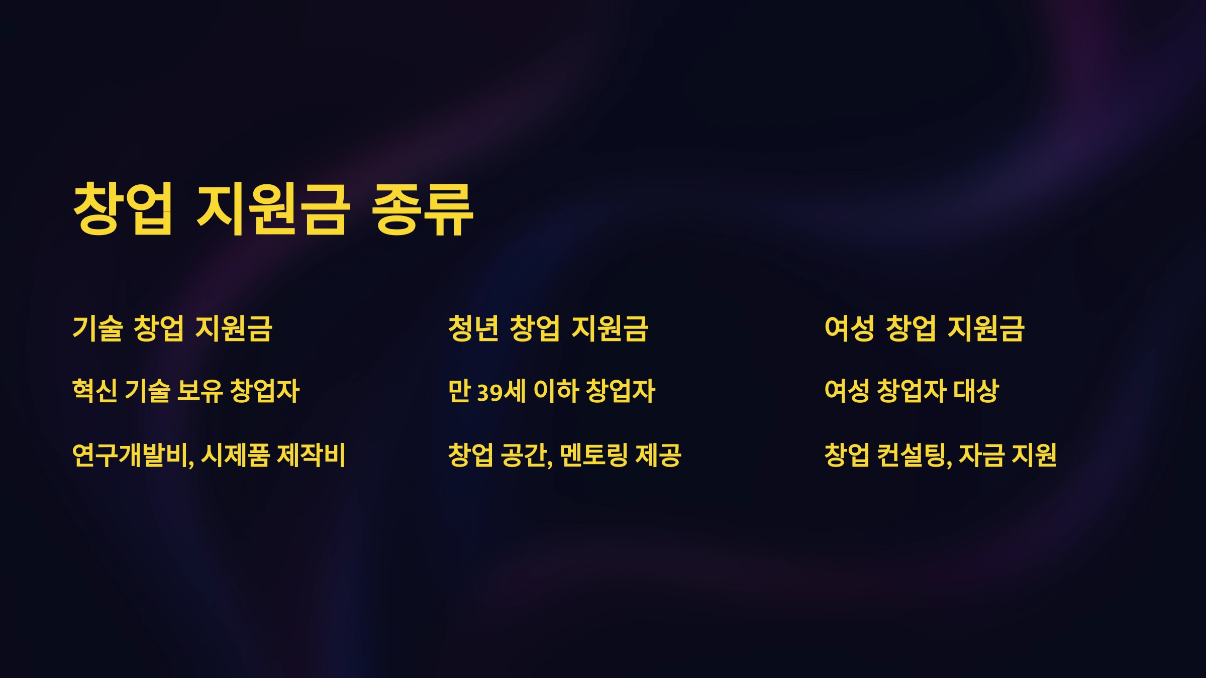 기술 창업 지원금은 혁신 기술을 보유한 창업자에게 주어지며, 연구개발 및 상용화를 지원합니다.