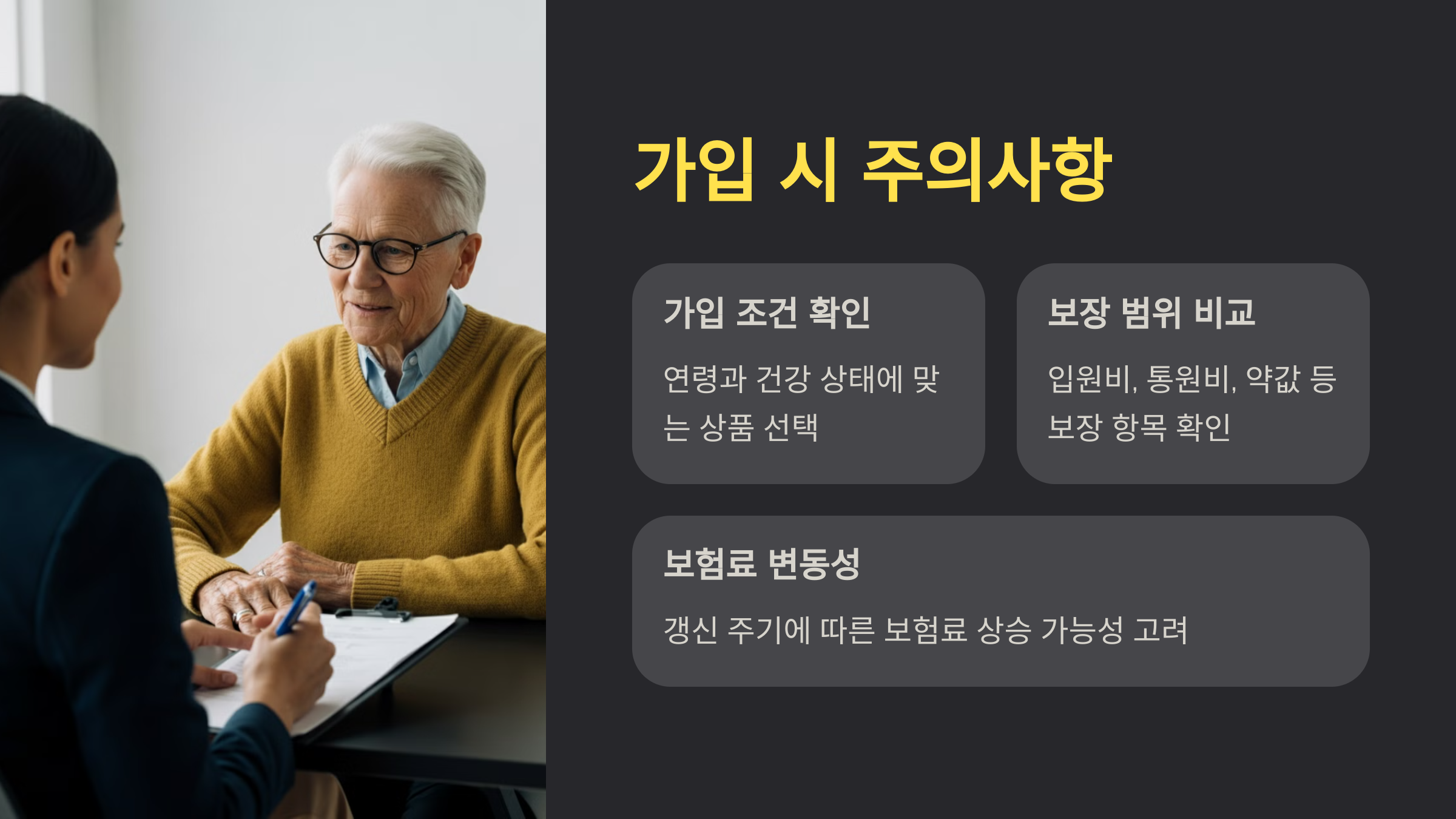 건강 상태와 경제 상황에 맞춰 상품을 신중히 선택하세요. 다양한 상품을 비교하고 필요하면 전문가의 상담을 통해 최적의 선택을 하시길 권장합니다.