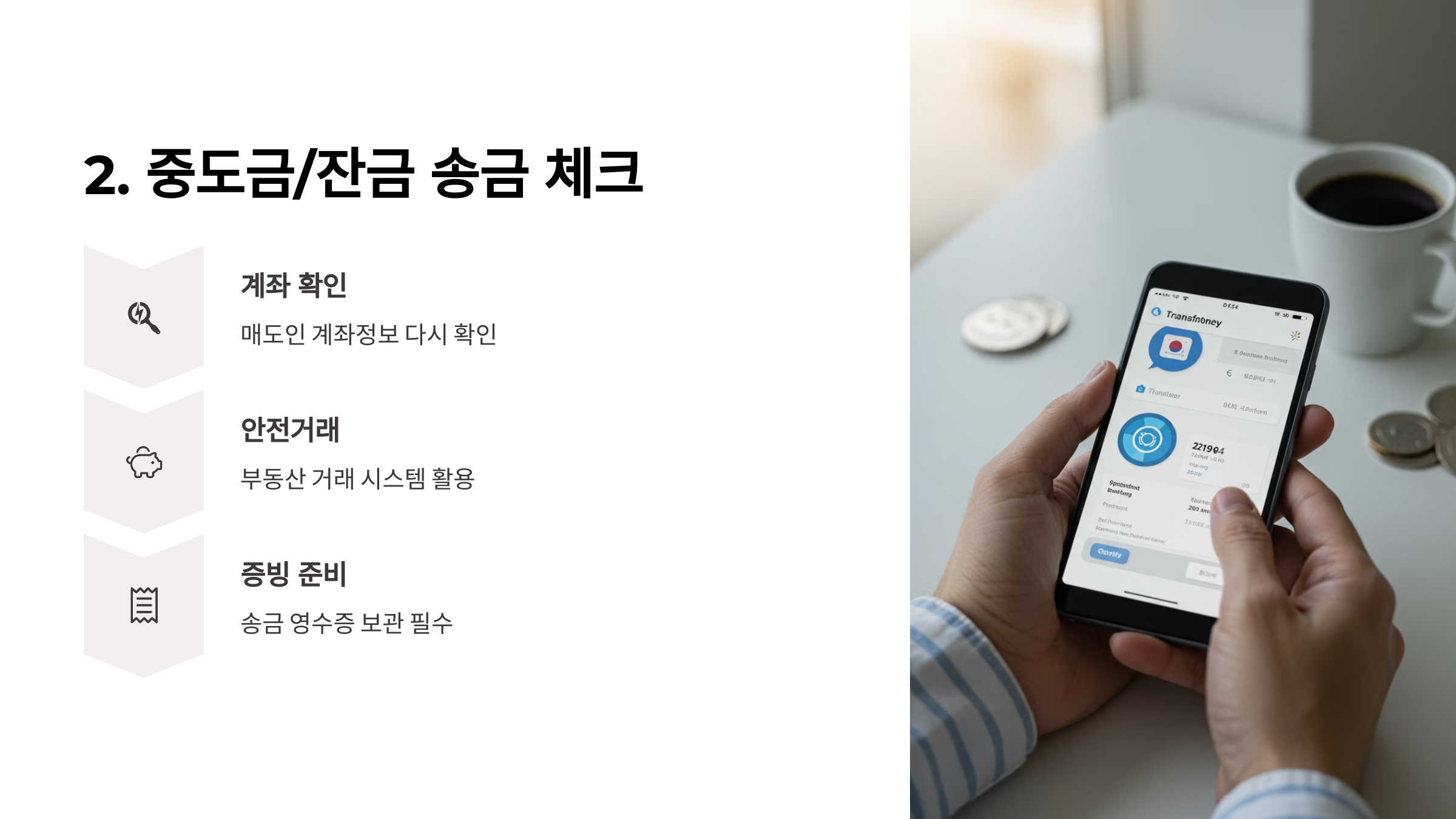 송금은 가급적 본인 명의 통장에서 실명으로 진행해야 해요. 중도금까지는 통장 이체, 잔금은 당일 실시간이체나 수표가 활용되기도 해요.