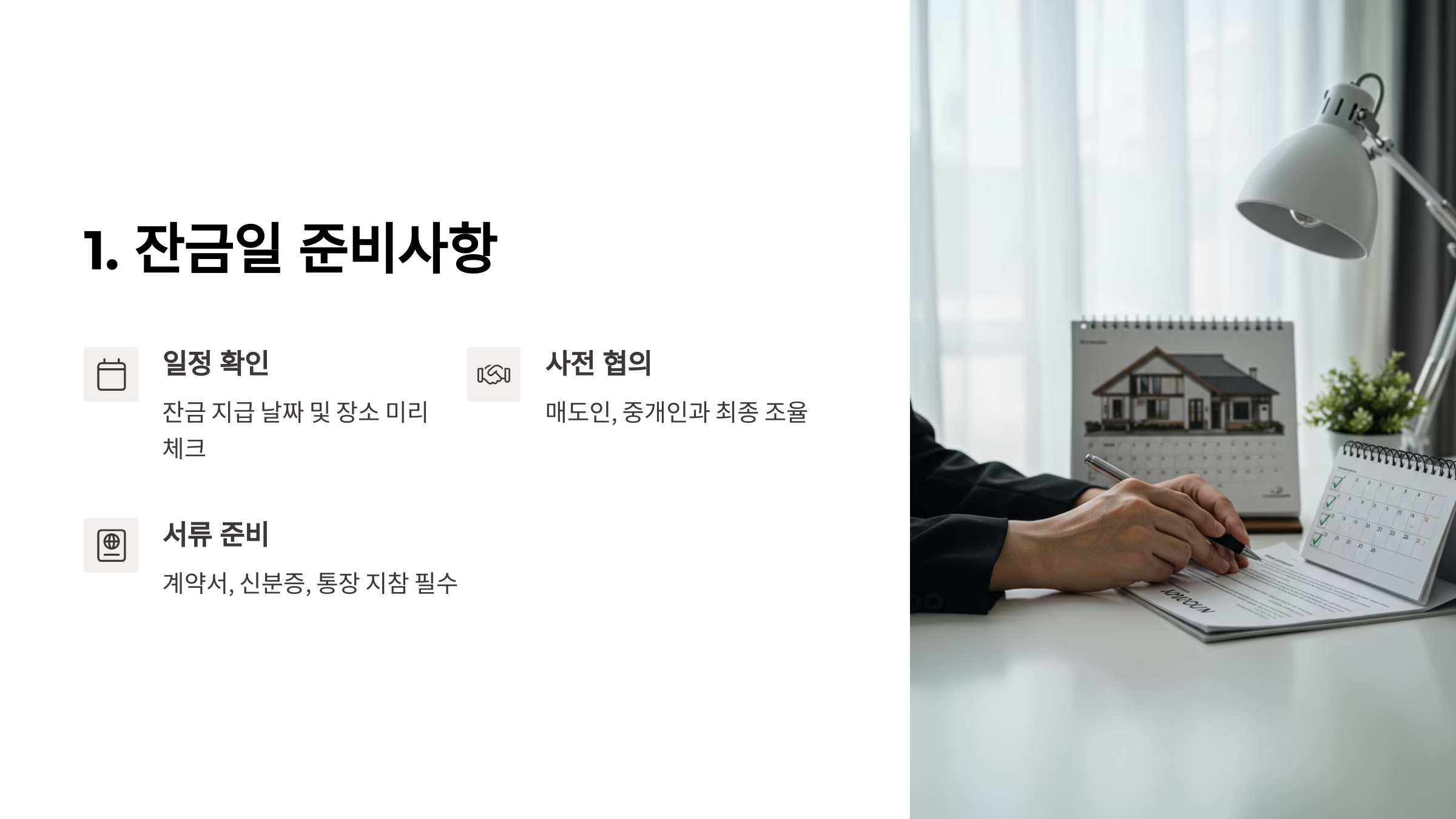 잔금일은 부동산 매매의 핵심이에요. 이날 모든 권리이전과 서류 교환, 열쇠 인도 등이 이뤄지기 때문이죠.